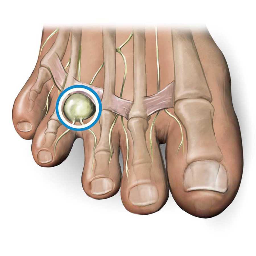 Межпальцевые нервы стопы проходят под и между плюсневыми костями дистальнее и иннервируют пальцы. Невралгия межпальцевых нервов развивается в результате ношения неудобной обуви либо, реже, растяжения нерва вследствие анатомических нарушений стопы. В результате хронической повторной травмы развивается доброкачественное утолщение нерва (неврома Мортона).